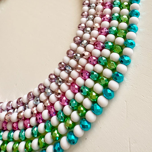 Le nostre perline colorate sono in resina o in vetro, le componenti metalliche e catenine sono in acciaio o in ottone placcato oro o argento.