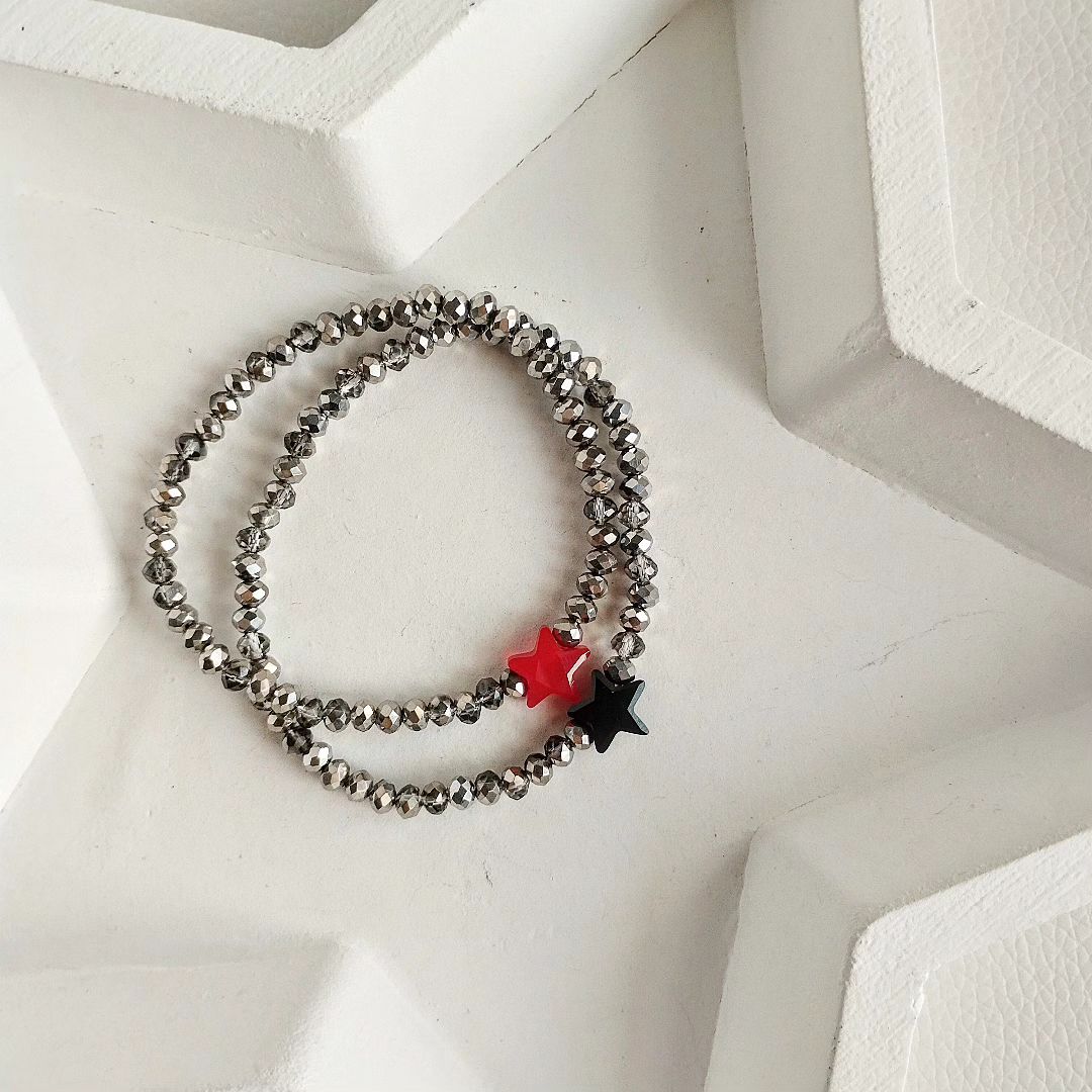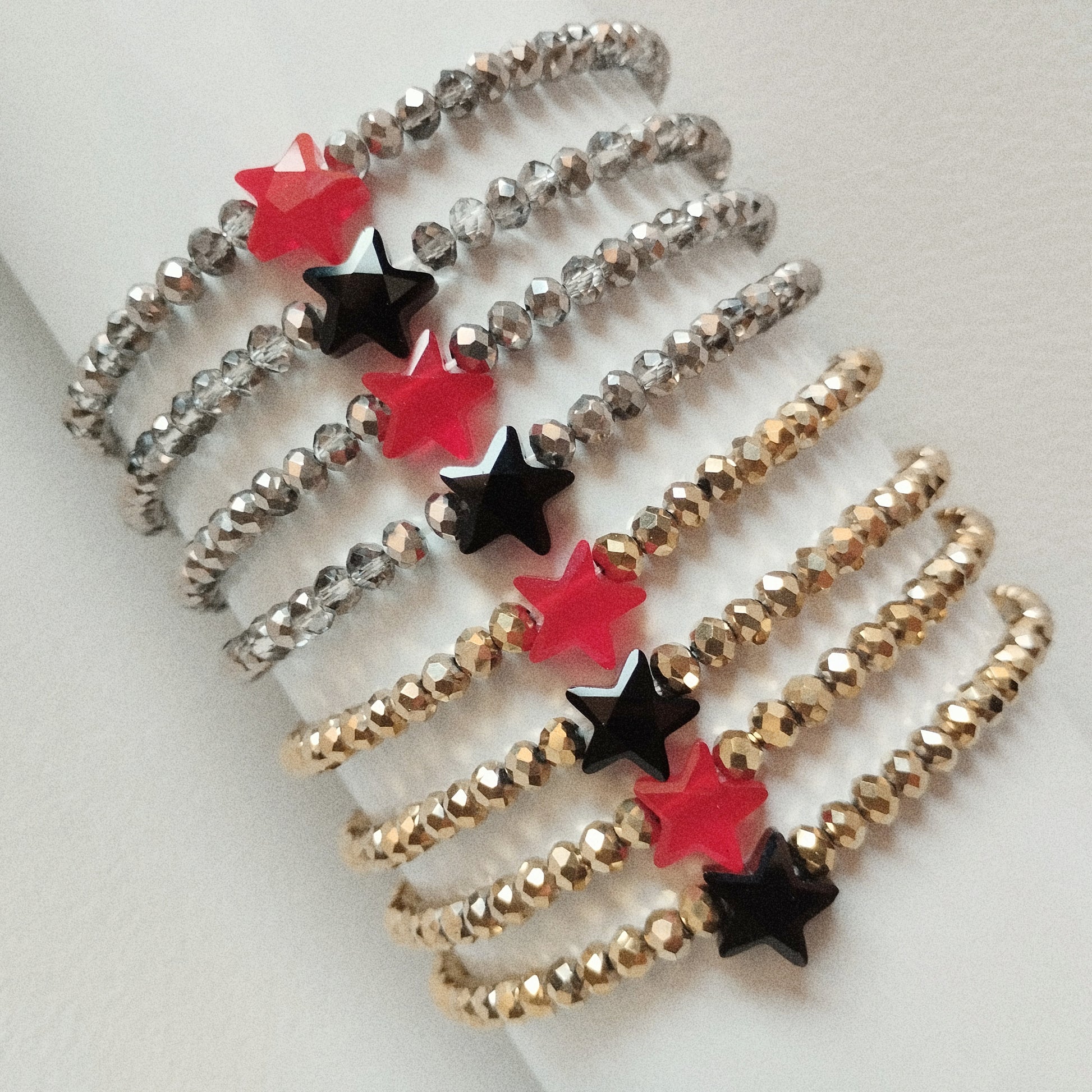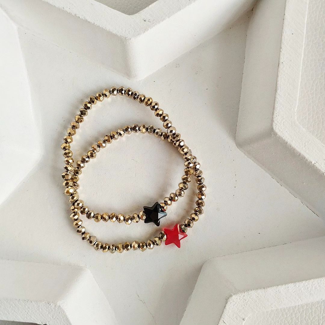 Braccialetti elastici Cristalli, realizzati con nuove perline sfaccettate, luminose e raffinate, color oro o argento impreziositi da MaxiStella rossa o nera.