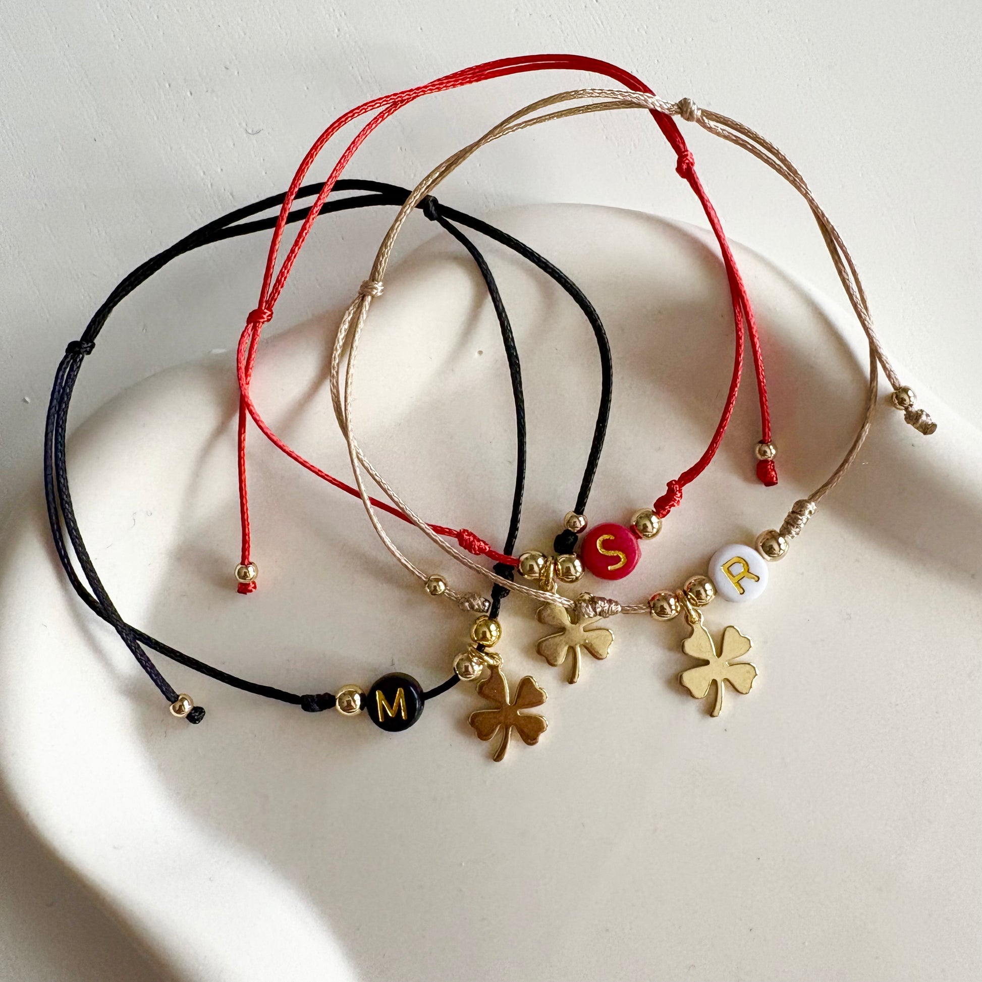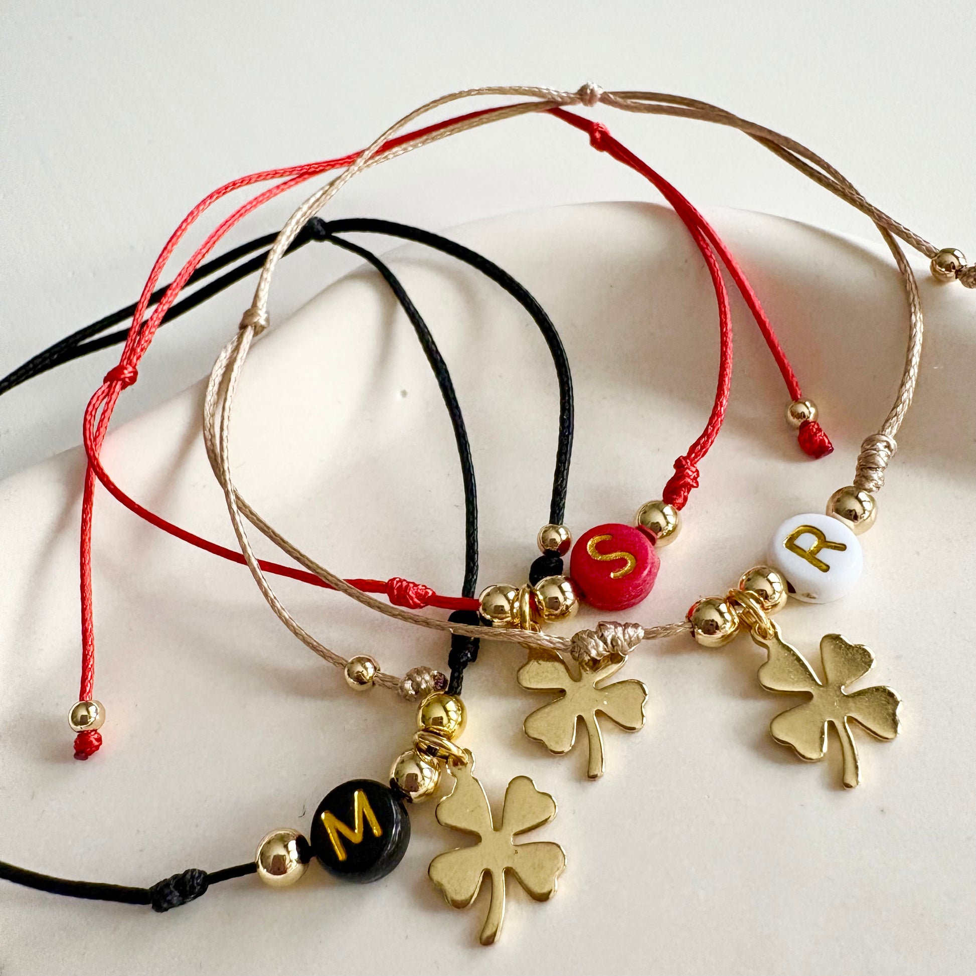 Braccialetti in cordino personalizzati con letterina e ciondolo a forma di quadrifoglio.