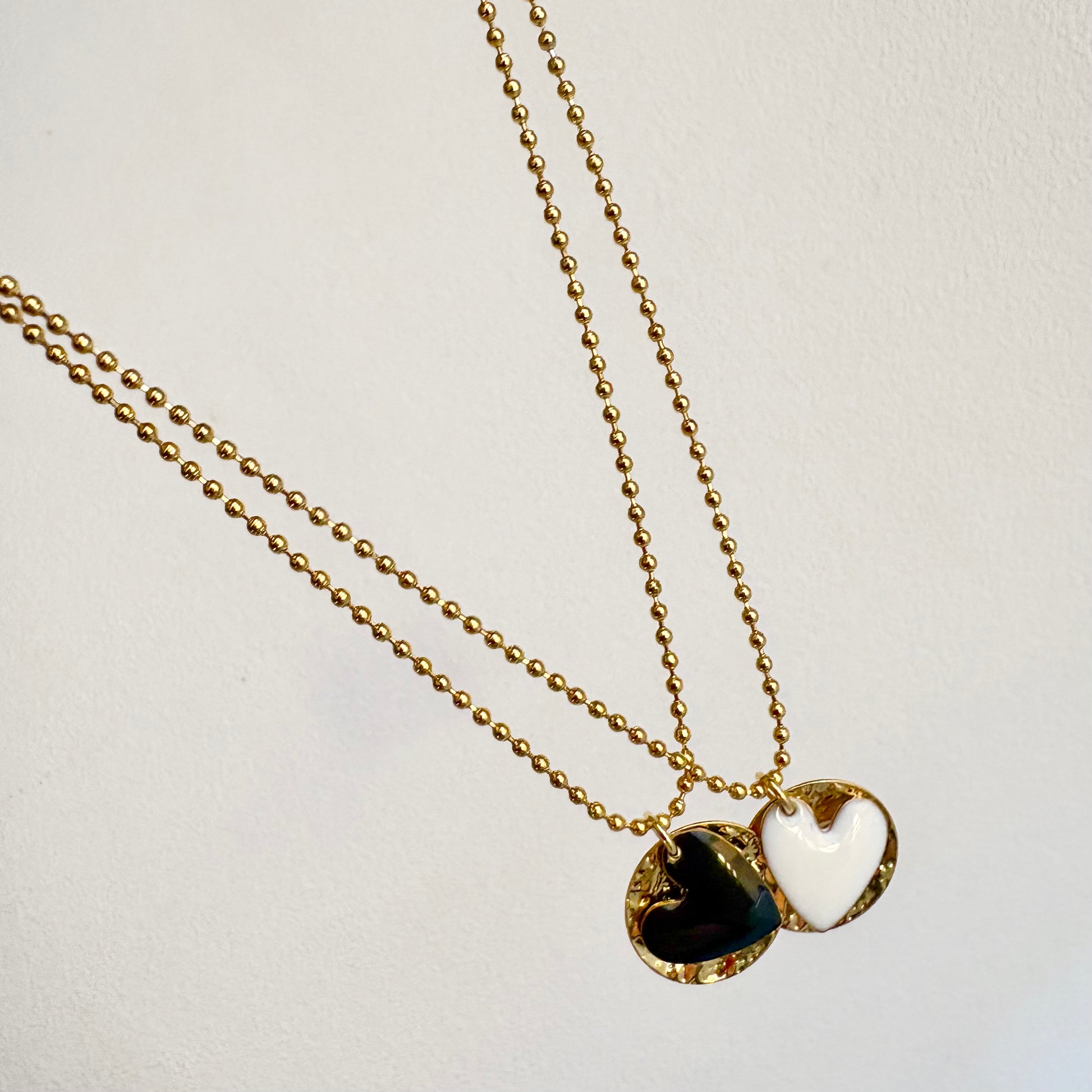 Catenina micropallini in acciaio placcato oro con medaglietta martellata e cuoricino colorato.