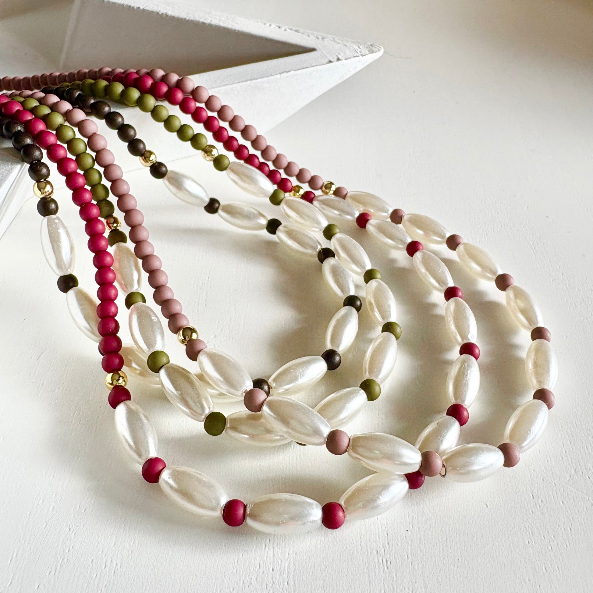 Nuova collana realizzata con perle allungate con effetto perlato alternate a perline colorate.