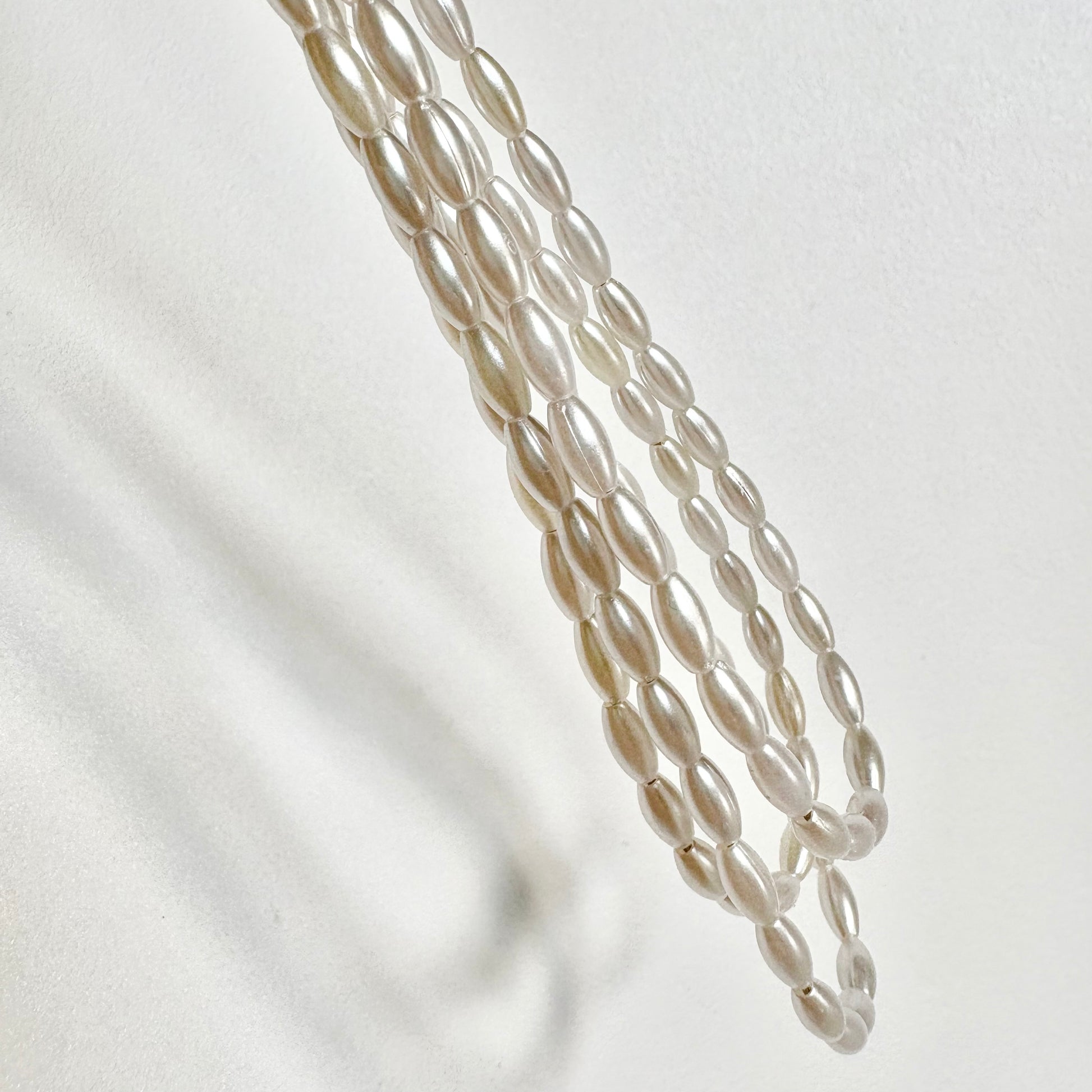 Collanina semplice e raffinata realizzata con perline in resina con effetto perlato a forma di chicco di riso.